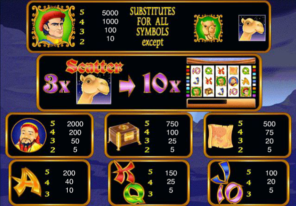 Символ разброса, вечный помощник Марко Пола, его спутник верблюд щедро раздаривает фри игры. Появление трех этих символов означает 10 бесплатных ходов, в которых кораблю пустыни отводиться роль дикаря, а в случае, если во время этих ходов они совпадут повторно, то вы получите в два раза больше фриспинов.